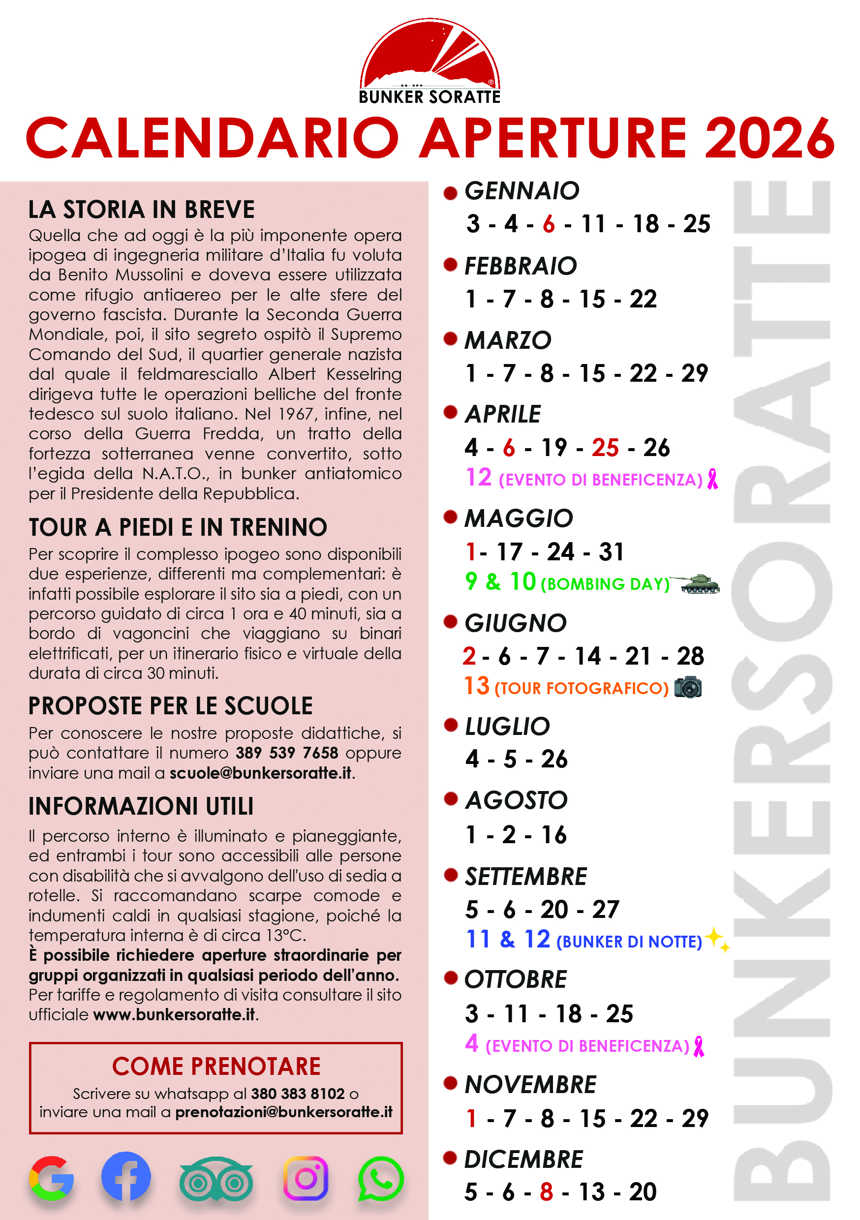 Per info e prenotazioni contattare il 3803838102 o via e-mail prenotazioni@bunkersoratte.it. Le prenotazioni vengono chiuse il sabato alle ore 13:00.